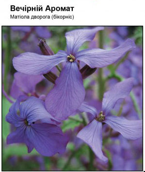 Матіола Вечірній аромат - однорічна травяниста рослина. Квітки лілово-рожеві, діаметром 1.5 см., з сильним приємним ароматом, особливл ввечері, в час розкриття квіток. Використовують для мавританських газонів, у палісадніках, на балконах. Холодостійка, невибаглива рослина. Насіння висівають у відкритий грунт в квітні-травні.