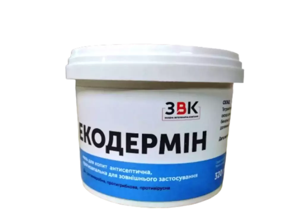 Фармакологічна форма Мазь від світло жовтого до зеленуватого кольору зі специфічним запахомТетраметилендиетилентетрамін Оксид цинку Сірка Натрію бензоат Нітрат срібла Допоміжні речовини Цитостатичний препарат з протимікробною, протигрибковою, противірусною дією. Мазь відновлює та має протизапальну, ранозагоюючу дію з антиоксидантними та імуномодулюючими властивостями. Перешкоджає деструктивним процесам, покращує мікроциркуляцію, має антитоксичну та аналгезуючу дію. Відновлює захисні та регенеративні властивості шкіри. Показання: Екземи, гнійно-некротичні і трофічні виразки, вірусні та грибкові захворювання, запальні дерматити, копитна гниль, гостра копитна гниль, міжпальцевий дерматит, пододерматит, спорові захворювання копит, попередження некробактеріозу, рани, абсцеси, злоякісні новоутворення шкіри та ін. – Цинк бере участь в синетзі кератину і тим самим визначає здоров’я і зовнішній вигляд шкіри і шерсті. – Сірка, котра входить у склад препарату взаємодіє з органічними речовинами на епідермісі і утворюються сульфіди і петатіонова кислота, які володіють протимікробною та протипаразитарною дією. – Гідроксид 1,8,3,6,-диендометиленг-1,3,6,8-тетраазациклодекан – дезінфікуючий інгредієнт, котрий володіє вираженими протимікробними, протигрибковими та противірусними властивостями. У вигляді аплікацій або під пов’язку, раз у 3-4 дні, на ретельно очищені, робочим розчином Екодезрину, оброблені місця ураження Курс лікування –3-5 аплікацій Профілактичну обробку копит потрібно проводити 2-3 рази в рік. – Необхідно ретельно почистити копито, звільнивши від бруду та некротизованих тканин – Потім протерти копито насухо. – Після цього продезінфікувати та нанести мазь. – Через 4-5 днів необхідно провірити оброблене місце. При необхідності маніпуляцію провести повторно.
