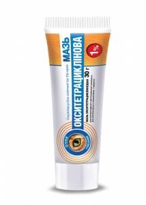 Опис Мазь від світло-жовтого до жовто-коричневого кольору. Склад 1 г препарату містить діючу речовину: окситетрацикліну гідрохлорид - 10,0 мг. Фармакологічні властивості Мазь має виражені бактеріостатичні властивості, які зумовлені дією окситетрацикліну - антибіотика широкого спектру протимікробної дії, активного до більшості грампозитивних та грамнегативних бактерій (Staphyllococcus sрр., Streptococcus sрр., Еscherichіа соli, Раsterella sрр., Salmonella sрр. та інші), а також Rickettsia spp., деяких видів Сhlamydia sрр. та Мусорlasma sрр., неактивний щодо Рseudomonas aeruginosa. Окситетрациклін проникає в клітини мікроорганізмів унаслідок дифузії та частково шляхом активного транспортування. Дія окситетрацикліну зумовлена порушенням синтезу білка, внаслідок блокади функції рибосом в чутливих до препарату мікроорганізмах. Застосування Лікування великої рогатої худоби, коней, овець, кіз, свиней, собак, котів та кролів, хворих на кон'юнктивіт, кератит, виразку рогівки та інших захворювань очей, що спричинені мікро-організмами, чутливими до окситетрациліну. Дозування Мазь закладають скляною лопаткою або вводять через канюлю туби (надійно зафіксувати голову тварини) за нижню повіку 1-2 рази на добу до видужання. Протипоказання Підвищена чутливість до окситетрацикліну. Застереження Немає. Форма випуску Пластикові контейнери або туби по 20, 25 30, 40, 45, 50, 100г. Зберігання Сухе темне, недоступне для дітей місце, при температурі від + 5°С до + 25°С. Термін придатності - 2 роки з дати виготовлення.
