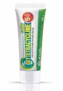 Опис Мазь від світло-жовтого до жовто-коричневого кольору із специфічним запахом Склад 1 г препарату містить діючу речовину: окситетрацикліну гідрохлорид - 50 мг. Фармакологічні властивості Окситетрациклін - бактеріостатичний антибіотик, який впливає на рибосоми бактерій, чим пригнічує синтез мікробних білків. Препарат має широкий спектр антимікробної дії, до нього чутливі грампозитивні та грамнегативні мікроорганізми (Staphyllococcus sрр., Streptococcus sрр., Раsterella sрр., Вrucella sрр., Соrуnebacterium sрр., Salmonella sрр., Еrysipelothrix ins., Еscherichіа соli та інші), а також актиноміцети, спірохети, рикетсії і хламідії; неактивний щодо синьогнійної палички. Застосування Лікування великої рогатої худоби, коней, овець, кіз, свиней; собак, котів та кролів, хворих на дерматит, при ранах різного походження та інших захворюваннях шкіри, які спричинені чутливими до окситетрацикліну мікроорганізмами. Дозування Перед застосуванням мазь перемішують, а також дану ділянку ретельно очищують від шерсті, сторонніх тіл, ексудату, некротичного матеріалу. Наносять тонким шаром на уражені ділянки шкіри або на рану і на 1-2 см навколо них 1-2 рази на добу. Зверху рекомендується накладати звичайну пов'язку, можна з пергаментним папером, у такому разі пов'язку змінюють 1 раз на добу. Протипоказання Підвищена чутливість до окситетрацикліну. Застереження Немає. Форма випуску Пластикові контейнери або туби по 20, 25, 30, 40, 45, 50, 100, 200 та 400 г. Зберігання Сухе темне місце при температурі від 5°С до 25 °С. Термін придатності - 2 роки з дати виготовлення.