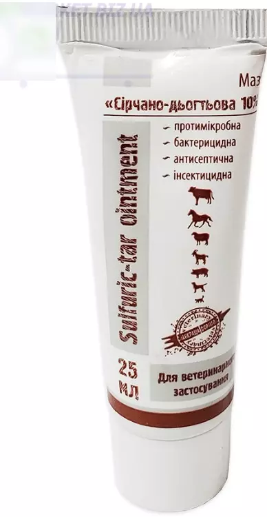 Мазь сірчано-дегтярна 10% використовується для лікування тварин у разі екзем, дерматитів, корости та інших хвороб шкіри.