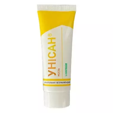 1 г препарата содержит: 10 мг хлоргексидина биглюконата, вспомогательные и формообразующие вещества до 1 грамма. Фармакологические свойства Владеет выраженным антисептическим действием. Ее компоненты эффективные в отношении вегетативных форм грамположительных и грамнотрицательных бактерий, а также дрожжей, дерматофитов, липофильних вирусов, хламидий. Кроме того, препарат владеет противовоспалительным, вяжущим, местным аналгезирующим действиями. Вследствие своей гипертоничности, мазь «Унисан» усиливает экссудацию, ускоряет течение гнойных воспалительных процессов, оказывает содействие очищению и заживлению инфицированных ран. Микроэлемент цинк, входящий в состав мази, незаменим для нормального функционирования кожи. Применение Мазь «Унисан» применяется при всех заболеваниях кожи, где предполагается участие бактериальной и грибковой микрофлоры:Стафилококкоз кожи Пиодермии (все виды) Импетигинозная экзема Кандидоз кожи (молочница) Дерматомикозы (трихофития, микроспория) Себорея Наружный отит Гнойные раны и поверхностные абсцессы Ожоги Применяется для всех видов животных. Препарат наносят на поврежденные участки кожи тонким слоем 1-2 раза в день. Продолжительность применения определяется видом патологического процесса. В любом случае необходимо применять мазь, по крайней мере, на протяжении 2-3 дней после исчезновения клинических признаков заболевания. При грибковых заболеваниях препарат наносят на протяжении 7-10 дней после исчезновения клинических признаков заболевания. При гнойных ранах и абсцессах пропитывают мазью марлевые салфетки, которыми заполняют рану или полость абсцесса. Перевязки проводят каждый день до полного очищения от гнойно-некротических масс. В глубокие пустоты мазь вводят в подогретом виде с помощью шприца (без иглы).