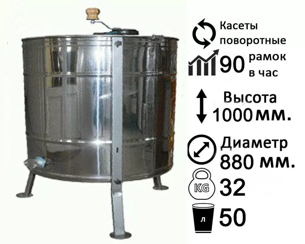 Касети поворотні 6 шт., мають запатентовану конструкцію, яка забезпечує збереження сот при відкачуванні меду на високих швидкостях. Виготовлені з кола марки Ст3, поздовжні прутки d=3мм, поперечні d=4мм, касети покриті полімерно-порошковою фарбою.