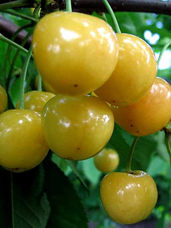 Черешня "Медовая сладость". Плоды средней величины или крупные, плоскоокруглой формы. Они покрыты тонкой желтой кожицей. Мякоть тоже светлая, плотной консистенции, с большим количеством сока. Вкус десертный, сладкий. Деревья довольно высокие, до 5-6 метров. Особенно быстро они растут в первые годы, когда крона имеет пирамидальную форму. Затем она приобретает широкоокруглые очертания, а темпы роста замедляются. Листья крупные, гладкие, с заостренными концами, густо покрывают ветви. Цветки распускаются относительно поздно, и поэтому редко повреждаются возвратными заморозками. Они собраны в небольшие соцветия по 2-3 штуки