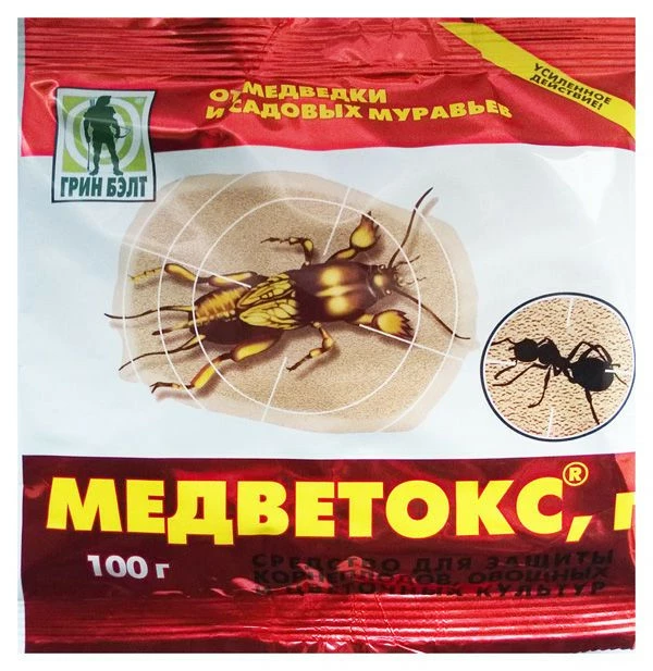 Медветокс гранулы (100гр) - препарат готовый к применению на натуральной основе в гранулах. Препарат успешно применяется для гибели медведки, а также эффективен против садовых муравьев. Используют для защиты корнеплодов, овощных и цветочных культур.