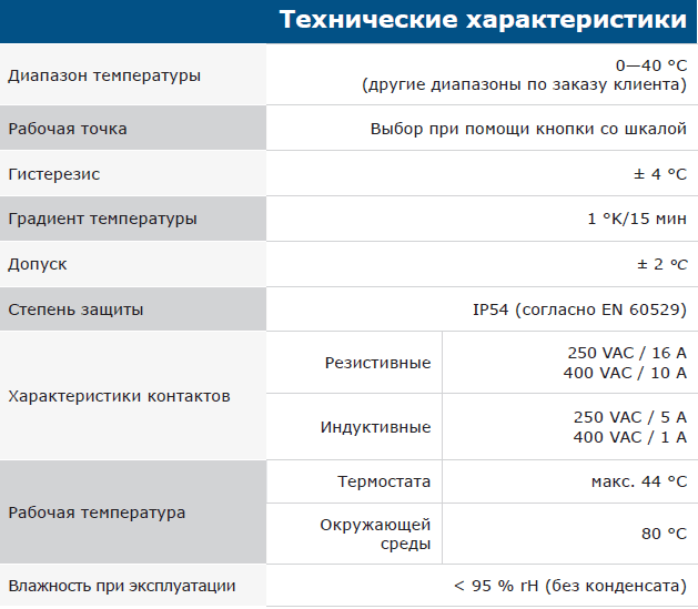 Промышленный термостат используется в сельском хозяйстве и промышленности (склады, теплицы, конюшни и т. д.). Для включения или отключения вентиляторов, электрических нагревателей и регуляторов по параметрам температуры. Этот термостат имеет газонаполненную трубку, которая гарантирует точную и надежную настройку температуры в диапазоне от 0 до 40 ° C. Механический термостат имеет релейный выход: 1 контакт C / O: 16 A (250 VAC) / 10 A (400 VAC).