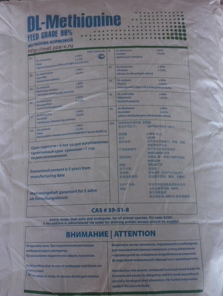 Метіонін кормовий (DL-метіонін сухий, 99%)