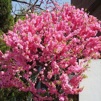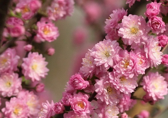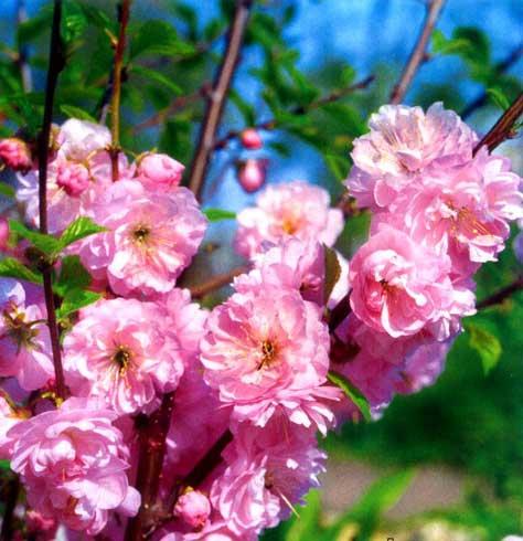 Квітки: Яскраво-рожевого забарвлення, махрові з 5 рожевими пелюстками на коротких квітконіжках, щільно притиснуті один до одного вздовж торішніх пагонів.