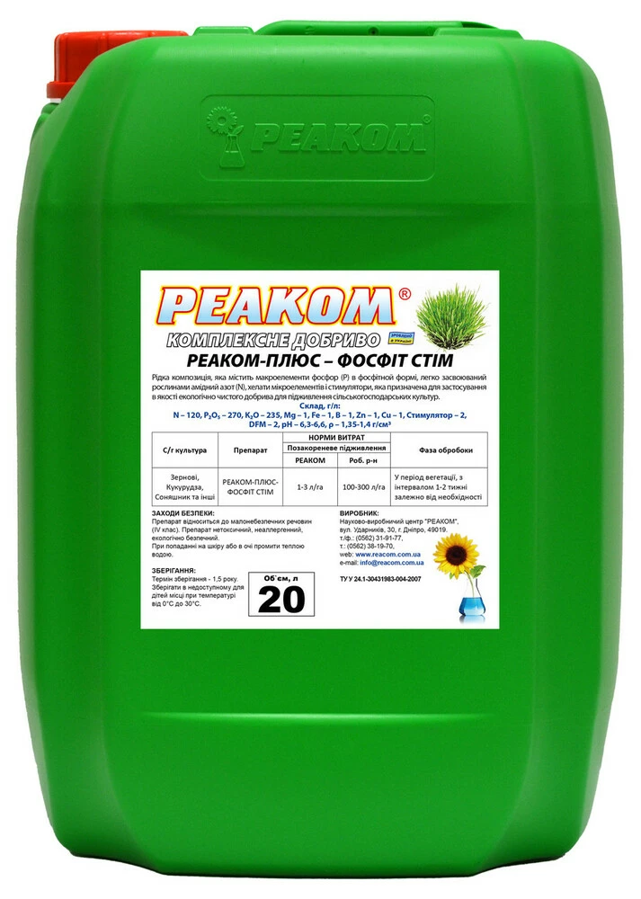 РЕАКОМ-ПЛЮС-ФОСФІТ СТИМ - препарат являє собою рідку композицію, яка містить макроелементи фосфор (Р) у найкращій для позакореневої підгодівлі рослин формі - фосфітній, а також легко засвоюваний рослинами амідний азот (N) . До складу добрива введено мікроелементи, на 100% «схелатовано» унікальної комплексної формули, розробленої підприємством «РЕАКОМ», загальна сума мікроелементів у цьому добриві становить 5 г/л, а макро - понад 620 г/л. Також містить у собі стимулятор росту та DMF”, Препарат прискорює відновлення вегетації рослин та стимулює розвиток кореневої системи після зимового періоду. початкових фазах весняної вегетації рослин. Змішується з ЗЗР та іншими добривами.N120 г/л Zn 1г/л P2O5 270 г/л Cu 1г/л K2O 235 г/л  Mg 1г/л  Fe 1г/л рН 6.3-6.6 Стимулятор 2г/л густина 1.35- 1,4 м3 B 1г/л
