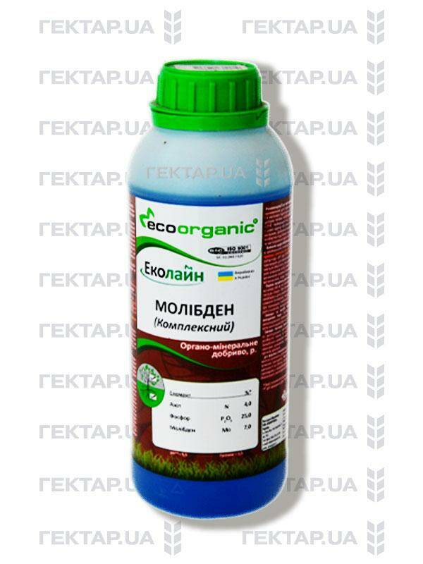 Еколайн Молібден Комплексний - концентроване молібденове мікродобриво розроблене для усунення прояву дефіциту молібдену, а також для позакореневого підживлення культур, особливо вимогливих до умов забезпечення цим мікроелементом (бобові культури, плодові культури).
