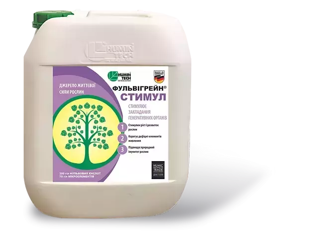Фульвігрейн Стимул розроблений спеціально для стимуляції активного росту рослин. Фульвові кислоти, які входять до складу препарату, є природним стимулятором росту. Обробка рослин у критичні фази препаратом сприяє активному поділу клітин, закладанню генеративних органів, стимуляції імунітету та фотосинтезу. Забезпечує високий рівень урожаю.