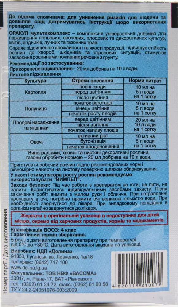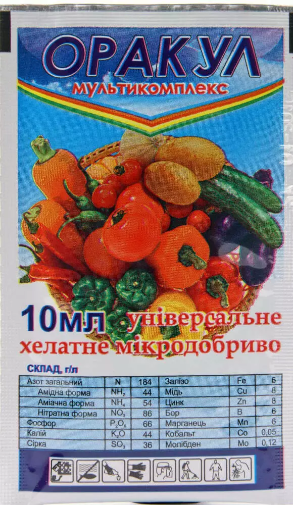 Оракул мультикомплекс – комплексне універсальне рідке мікродобриво для позакореневого підживлення польових, овочевих, плодових, ягідних, декоративних культур, лучних та газонних трав, яке містить пом’якшувач води.