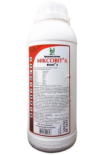 Міксовіт А (1 л) - комплекс жиророзчинних і водорозчинних вітамінів. Препарат для профілактики та лікування дефіциту жиророзчинних та водорозчинних вітамінів, підвищення загальної резистентності організму, стимуляції обміну речовин, зменшення негативного впливу стресів під час транспортування, вакцинації, зміни раціону тощо, а також з метою прискорення зростання при відгодівлі. Покращує показники конверсії корму з допомогою підвищення засвоєння кормів, стимуляції процесів травлення.