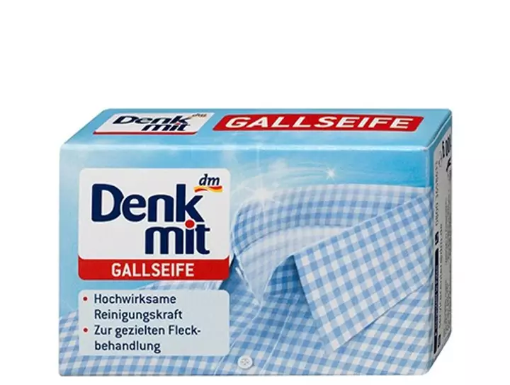 Мило для видалення плям Denkmit Gallseife . Завдяки своїй високоефективній миючій здатності мило Denkmit надійно видаляє такі плями, як жир, олія, помада, помідори, морква, чорнило та кров, а також ідеально підходить для попередньої обробки стійких забруднень на комірцях та манжетах.