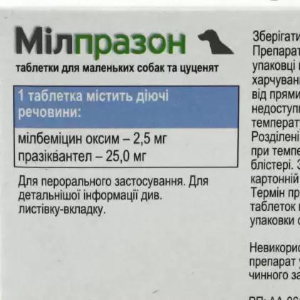 Милпразон таблетки для собак в якості діючих речовин містить мильбемицина оксим і празиквантел. Випускають препарат у двох модифікаціях: для маленьких цуценят і собак вагою до 5 кг, що містить в 1 таблетці в якості діючих речовин: мильбемицина оксим - 2,5 мг і празиквантел - 25 мг; і для собак вагою більше 5 кг, що містить в 1 таблетці в якості діючих речовин: мильбемицина оксим - 12,5 мг і празиквантел — 125 мг. В якості допоміжних речовин препарат містить микрокристаллическую целюлозу, лактози моногідрат, повідон, натрію кроскармеллозу, кремній колоїдний безводний, магнію стеарат, м'ясної ароматизатор (AromaMeat Flavour 10022), сухі дріжджі.