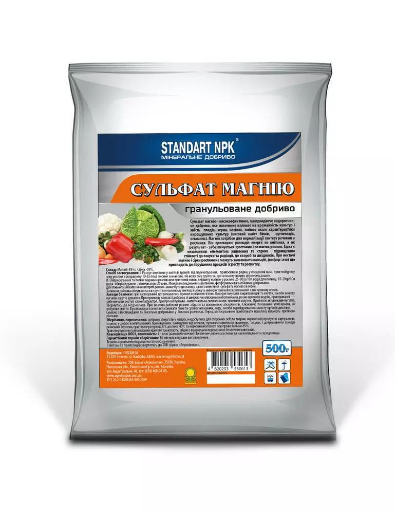 Сульфат магнію (магній сірчанокислий), упаковка 500 г - високоякісне добриво для сухого внесення та позакореневого підживлення всіх видів сільськогосподарських культур.