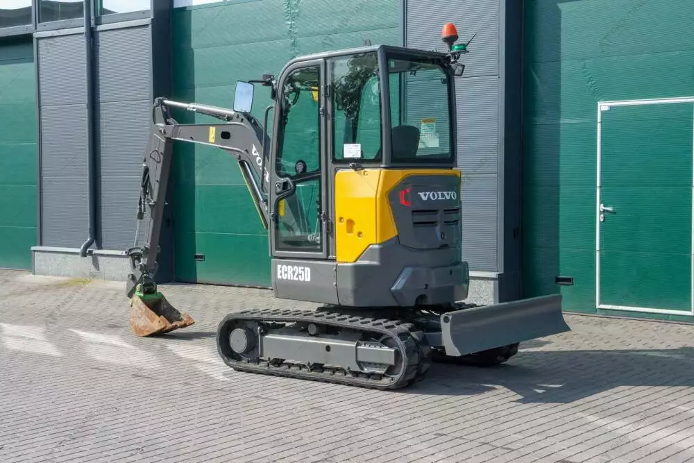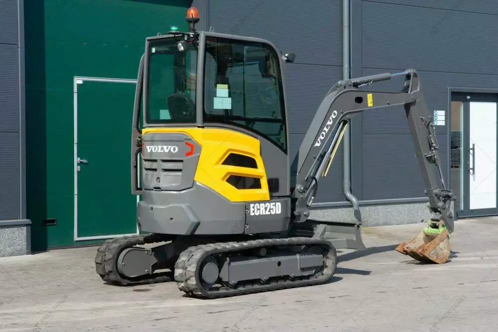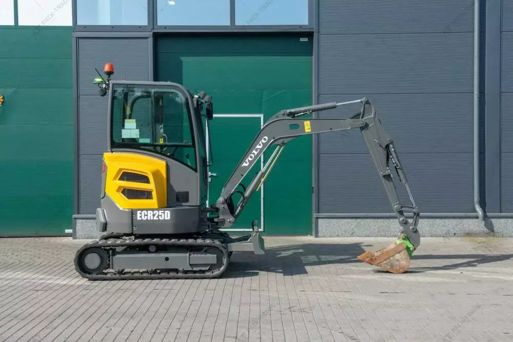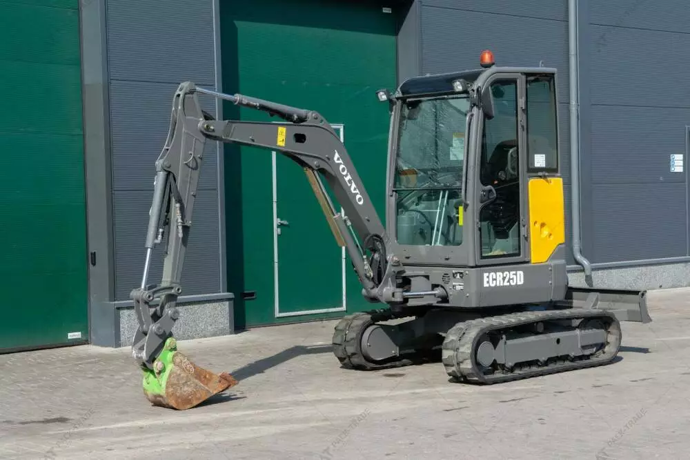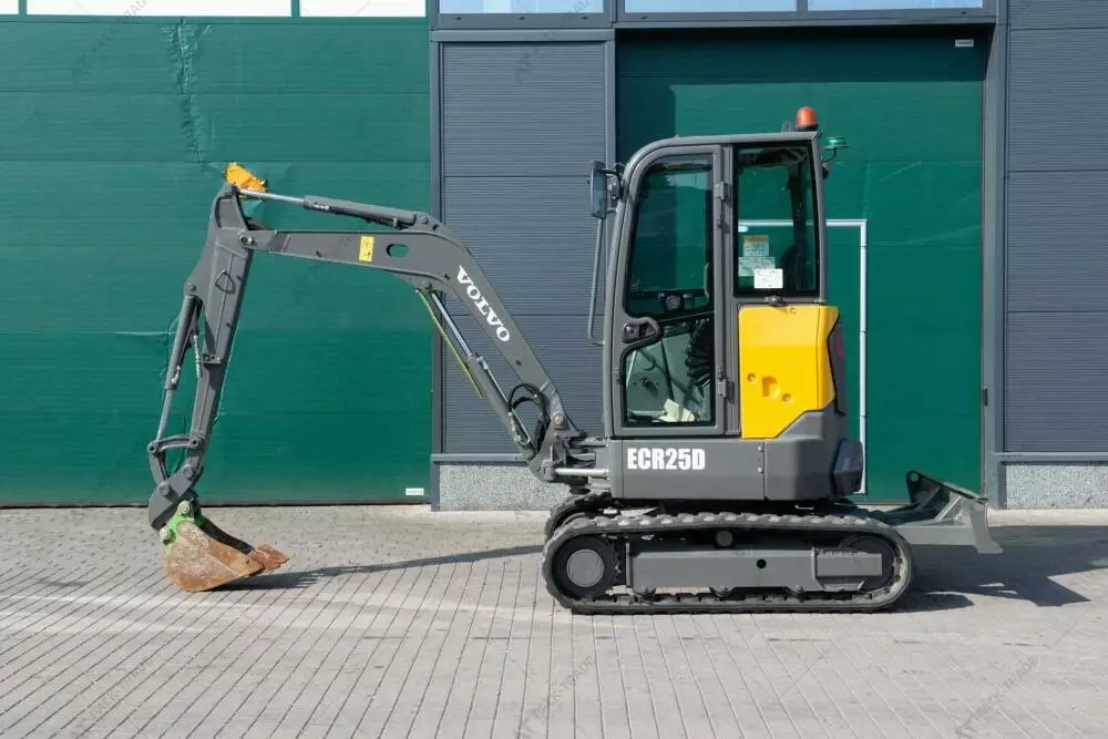 Міні екскаватор б/в Volvo ECR25D, 2018 р/в, з напрацюванням 1014 м/год. Потужність двигуна – 15.5 кВт. Вага – 2475 кг. Загальна висота — 2,5 м. Розмір гусениці: Volvo 1180344. Стріла — Standart. Швидкоз'єм ковша. Планувальний ківш – м.Кабіна, робоче освітлення. Глибина копання — 2,76 м.