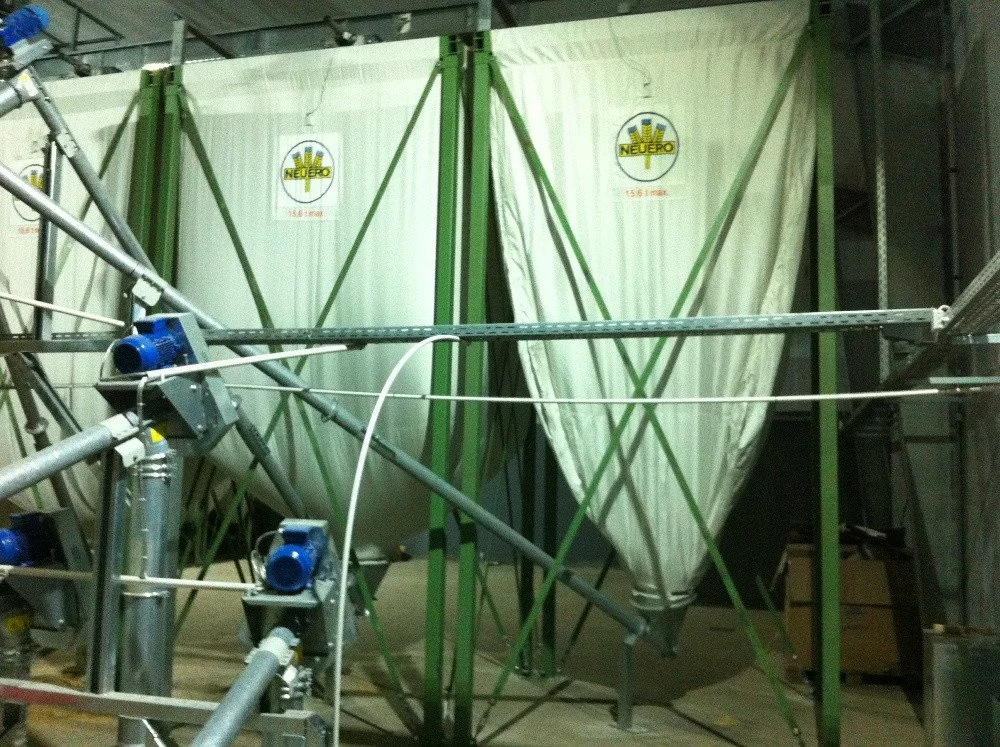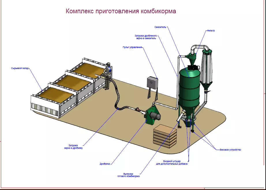 Міні комбікормові установки Neuero складаються з пневматичної зернодробилки, змішувача, шнеків для подачі зерна, ємностей для подрібнення компонентів, накопичувальних бункерів, системи керування та інших складових. Комплектація лінії підбирається індивідуально залежно від потреби у комбікормі, кількості вихідних компонентів комбікорму та ін. параметрів.