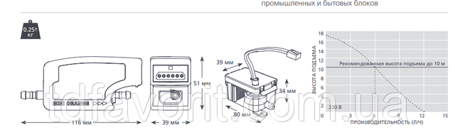 Для внутреннего монтажа, питание 230 В АС, 16 Вт, макс. производительность до 12 л/час (при отсутствии подъема, см. диаграмму), макс. подъем до 10 м, 21 дБ(А) @ 1м, размер насосной группы - 51х116х39 мм, бачка - 80х39х34(h) мм. С дополнительным контактом для откл. кондиционера при превышении аварийного уровня в бачке. Антисифонное устройство в комплекте.