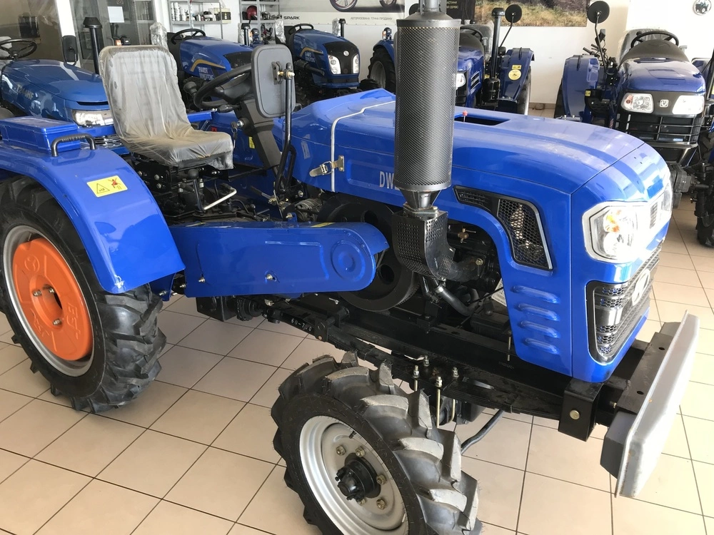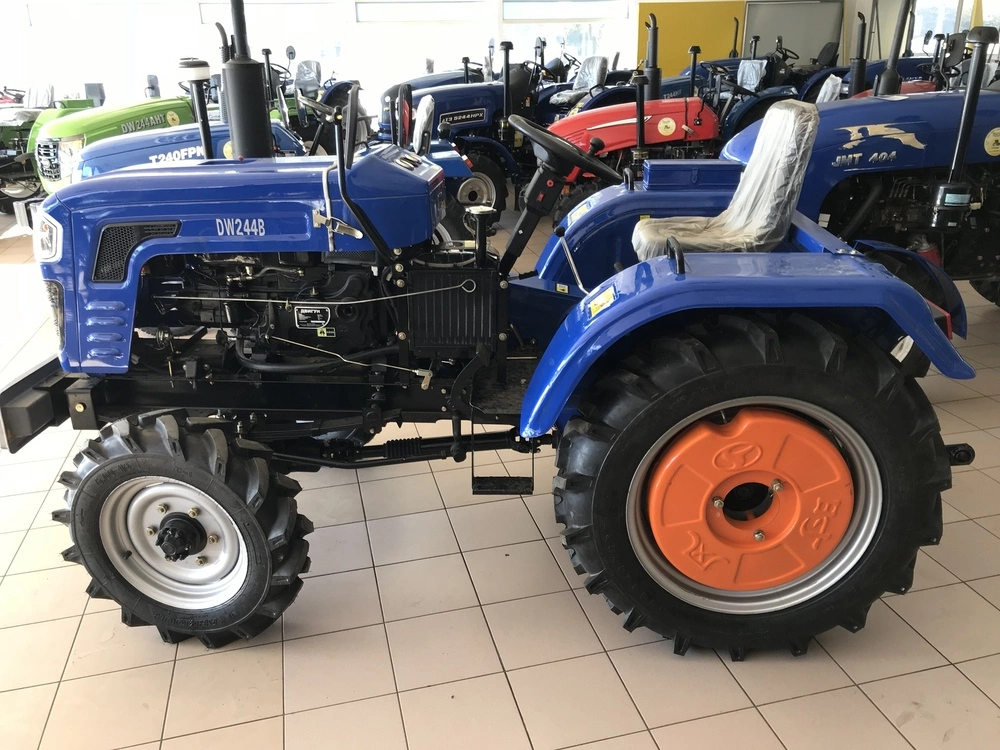 Доступний і простий по конструкції повноприводний трактор DW 244B потужністю 24 к.с., що відрізняється наявністю клиноремінної передачі від двигуна до коробки передач. Компоновка трактора рамна, передній ведучий міст підресорений. Двигун одноциліндровий з горизонтальним розташуванням циліндра і водяним охолодженням. Наявність ремінної передачі дозволило спростити конструкцію, значно полегшити проведення робіт з обслуговування та ремонту, знизити експлуатаційні витрати. Еластичність пасової передачі запобігає поломки двигуна і трансмісії через перевантаження або невмілого вибору швидкості. Оснащений гальмами барабанного типу, дводисковим зчепленням сухого типу, шестерінчастою коробкою передач на 8 швидкостей вперед і 2 назад, валом відбору потужності. Навісна система стандартна 3-точкова з гідроприводом, маються електророзетка і гідравлічний вихід. Для забезпечення підвищеного рівня безпеки і комфорту трактор обладнаний потужною дугою безпеки і великим знімним сонцезахисним козирком з посиленим кріпленням.