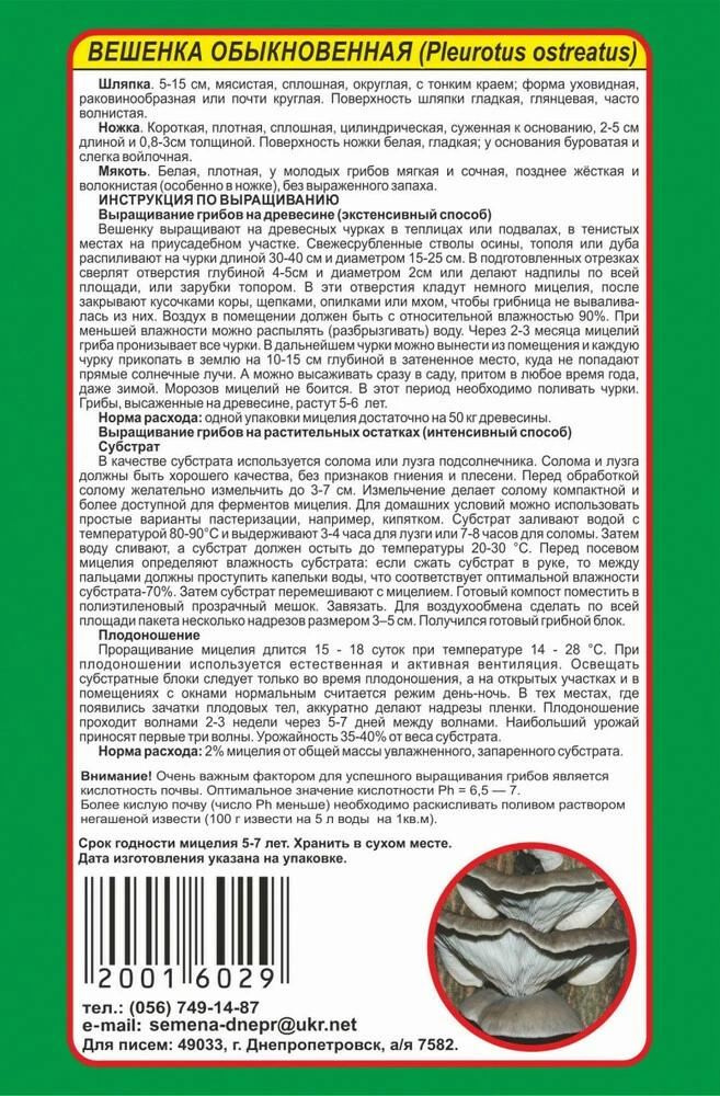 Опис Міцелій Глива звичайна 10 г, Насіння України