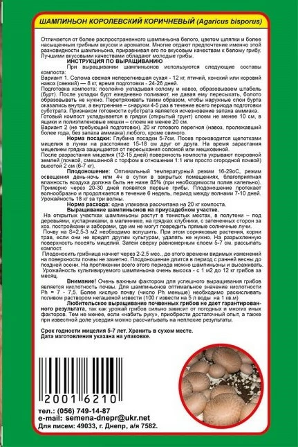 На пакеті наводиться докладна інструкція з вирощування. 10 г міцелію достатньо для приготування грядки площею 2-3 кв. м.