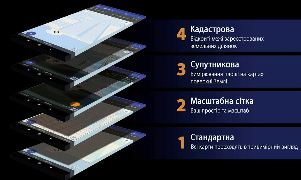 geometer – це нове програмне забезпечення з оновленими функціями. Ви отримаєте можливість більш точного позиціонування на місцевості, точне вимірювання площі, довжини, тривимірне вимірювання, розміщення точок на місцевості, збереження координат, введення своїх координат, оцифрування садів та інших об'єктів, спеціальні розмітки на місцевості, вирізування ділянок, вбудовування нових об'єктів. Все керування здійснюється одним дотиком до екрана. Програма має інтуїтивно зрозуміле меню, тому не потребує спеціальної підготовки користувача.