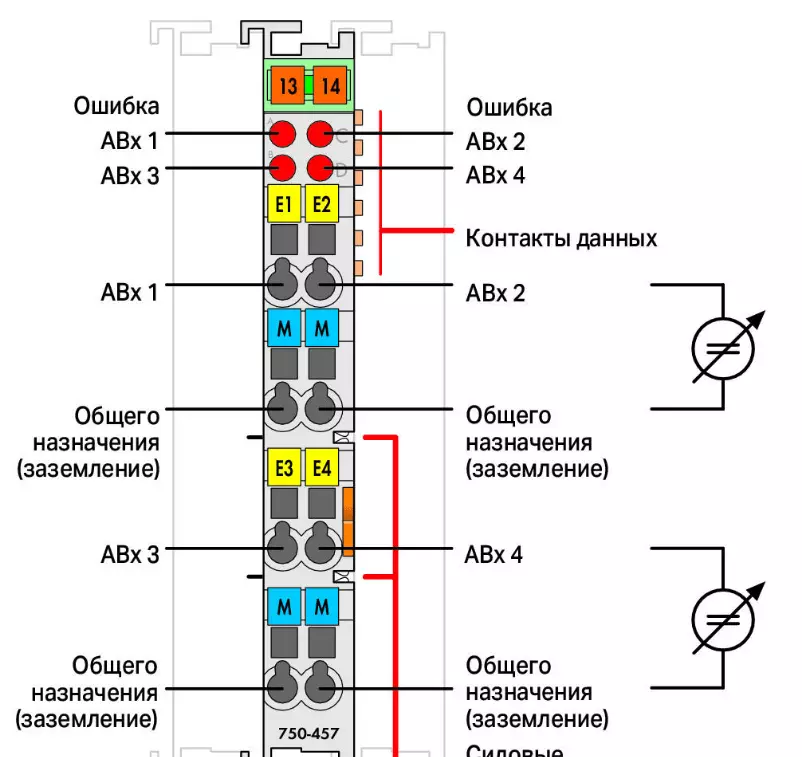 Модуль аналогового введення здатний генерувати сигнали зі значенням ±10 В, вхідний сигнал передається з 12-бітовим дозволом.