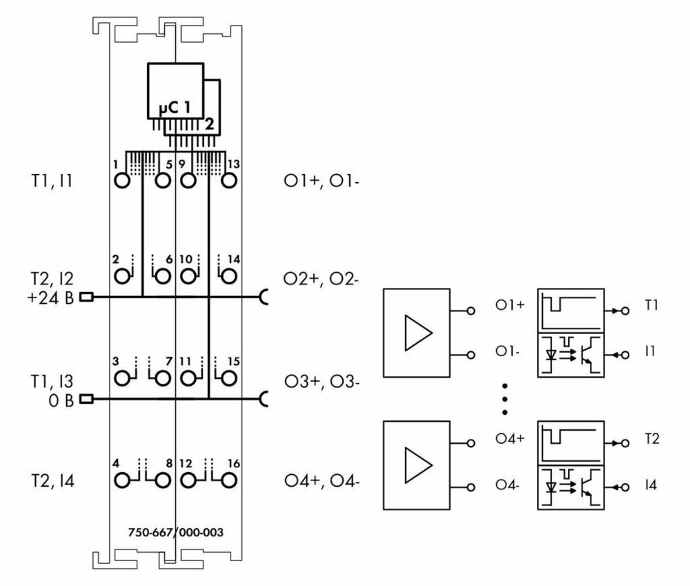 Модуль відмовостійкий 4/4-канальный дискретний вхід/вихід; струму; 2 А; PROFIsafe V2.0 iPar Wago. Оснащений 4 виходами потужності (O1 - O4) і 4 входами (I1 - I4), що синхронізуються. На датчики може безпосередньо подаватися 24 В, або вони можуть живитися через 2 виходи з тим, що різним, що тактує (T1 - T2).