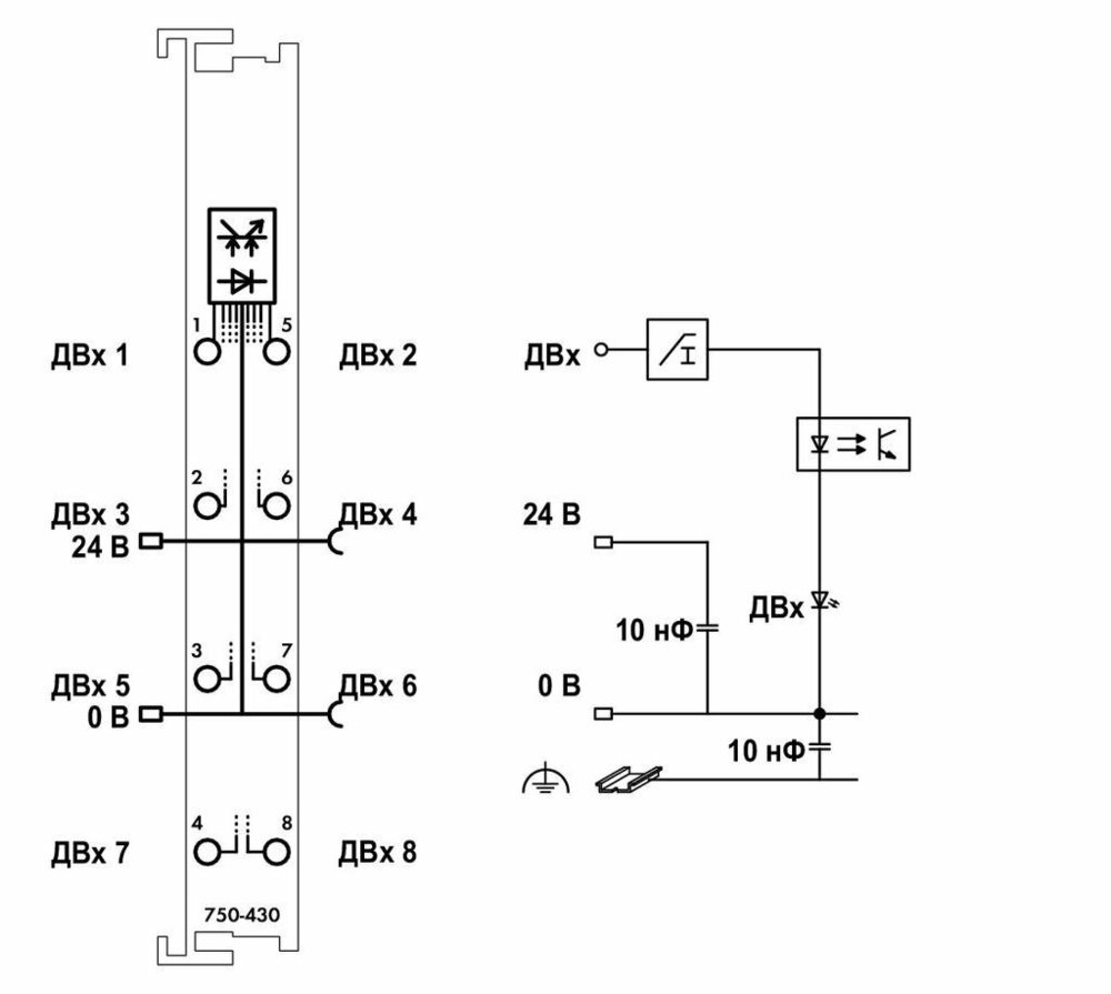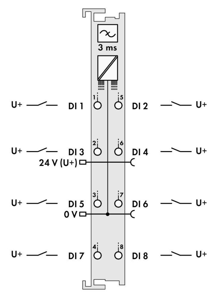 Модуль введення для розподільної шафи WAGO - I/O - SYSTEM 750/753. Має 8 дискретних введень. Приймають сигнали, що управляють, від дискретних польових пристроїв (датчиків і тому подібне).