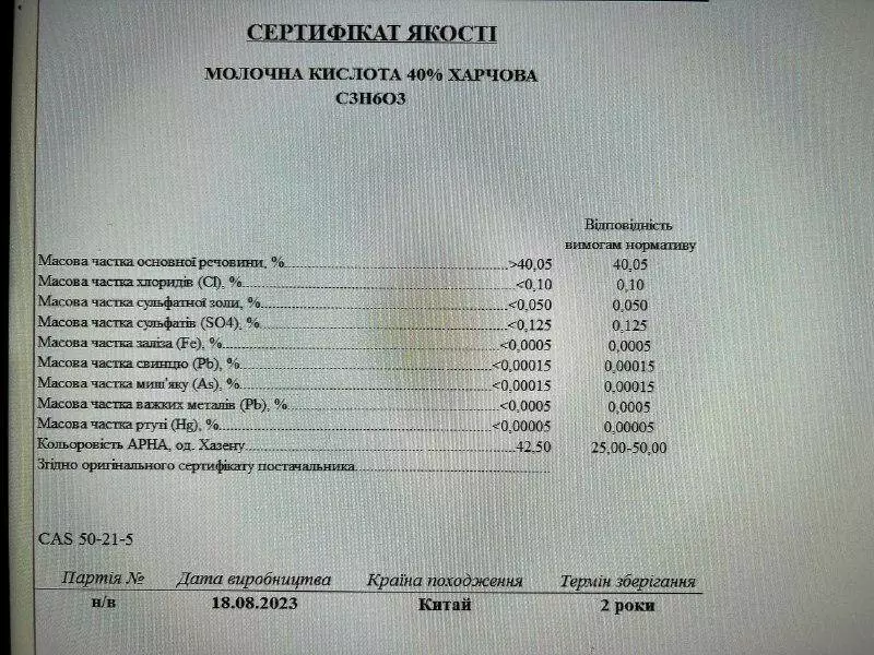 Молочна кислота (лактат) – одноосновна карбонова кислота з трьома атомами вуглецю, що містить гідроксильну групу. Солі та ефіри молочної кислоти називаються лактатами. Молочна кислота утворюється при молочнокислому бродінні цукрів і відіграє важливу роль метаболізмі. Майже прозора, трохи жовтувата гігроскопічна сиропоподібна рідина зі слабко кислим запахом, що нагадує запах кислого молока. Розчинна у воді, етанолі, погано - у бензолі, хлороформі та інших галогенвуглеводнях.