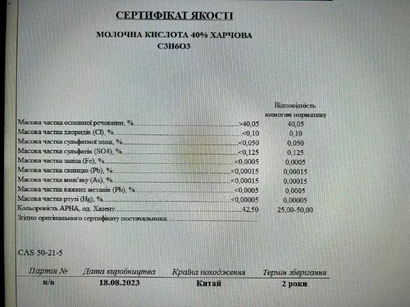 Молочна кислота 40% каністра 20 л