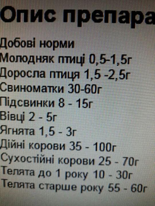 Кормову добавку застосовують тваринам і птиці всередину в суміші з сухими кормами або вологими мешанками, подрібненими коренеплодами у відповідності з наведеними нижче добовими нормами витрати (грам) на одну голову:
