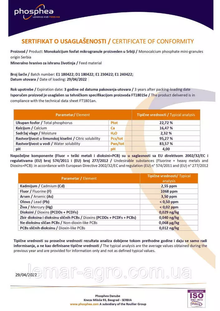 Монокальційфосфат Monocalcium phosphate Phosphea (Сербія) - 25 кг