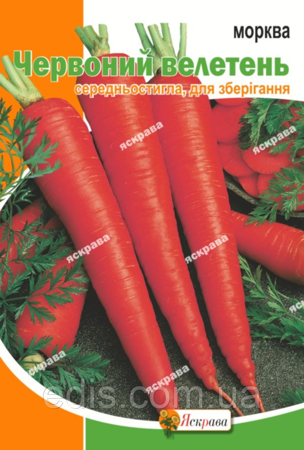 Морква Червоний велетень 20 гПізньостиглий сорт. Вегетаційний період від сходів до технічної стиглості 120-130 днів. Коренеплоди вирівняні, конусоподібної форми, червоно-оранжевого кольору, довжиною 20-25 див масою 100-150 г, відмінних смакових якостей. Сорт цінується за високий вміст каротину і відмінний товарний вигляд. Використовується для тривалого зимового зберігання, споживання в свіжому вигляді і переробки.