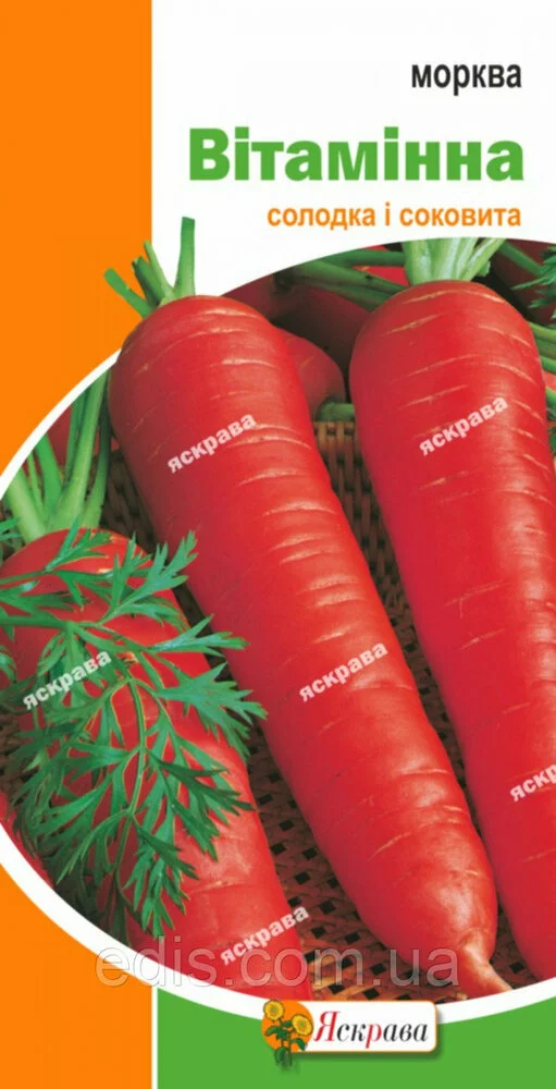 Морква Вітамінна 3 рСередньоранній сорт. Період від сходів до збирання 80-100 днів. Коренеплід циліндричний з тупим кінчиком, червоно-оранжевого кольору, довжиною 15-19 см, масою 80-165 р. М'якуш соковитий, смачний, дуже соковитий; серцевина маленька, за кольором мало відрізняється від м'якоті. Рекомендується для виготовлення морквяного соків завдяки підвищеному вмісту каротину, для споживання в свіжому вигляді і зимового зберігання.