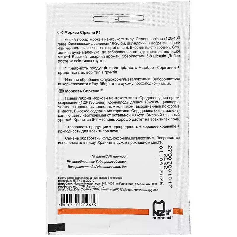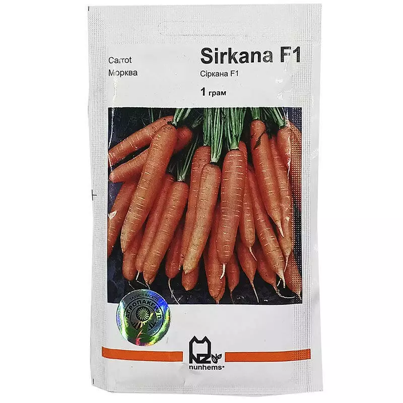 Морква Сіркана F1 - середньопізній гібрид, від сходів до повної стиглості проходить близько 125-130 днів. Коренеплоди виростають середньої крупності, щільні, з рівною поверхнею. Довжина їх близько 20 см, вага - до 160 грамів. М'якуш відрізняється соковитістю, цукристістю і має глибокий помаранчевий окрас. Плоди зберігають смак при всіх видах кулінарної обробки, в замороженому і консервованому вигляді. У прохолодному місці може зберігати кілька місяців без втрати товарних властивостей.