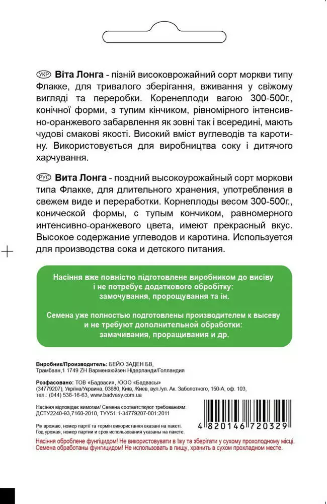 Пізній високоврожайний сорт моркви типу Флакке, для тривалого зберігання, вживання у свіжому вигляді та переробки. Коренеплоди вагою 300-500 г., конічної форми, з тупим кінчиком, рівномірного інтенсивно-оранжевого забарвлення як зовні так і всередині, мають чудові смакові якості. Високий вміст вуглеводів та каротину. Використовується для виробництва соку і дитячого харчування.