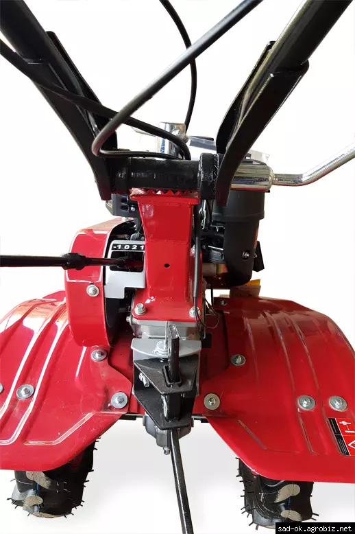 Для удобной и комфортной работы и транспортировки руль сделан регулируемым по высоте, плюс есть поворот в сторону. При установке на мотокультиватор металлических грунтозацепов на него можно агрегатировать навесное оборудование, такое как: плуг, окучник, картофелекопалку, плоскорез, картофелесажалку, прицеп и др.