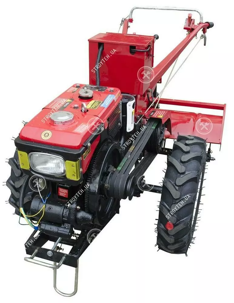 Несомненным преимуществом оборудования является наличие колес увеличенного диаметра с агрессивным протекторным рисунком для максимально эффективного сцепления с почвой. Также не остается без внимания наличие большой галогенной фары для работы и передвижения в темное время суток, а также возможность изменения высоты и угла наклона рукоятки. Особенности технического оснащения: Мощный четырехтактный дизельный двигатель с системой водяного охлаждения. Активная почвофреза, ширина обработки 1.2 метр. Большой выбор пониженных и повышенных передач. Галогенная фара для работы и передвижения в темное время суток. Блокировка дифференциала, делает мотоблок выносливым и высокопроходимым. Запуск посредством электростартера. Три приводных ремня. Трехручейковый шкив.