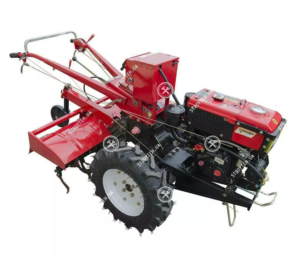 Несомненным преимуществом оборудования является наличие колес увеличенного диаметра с агрессивным протекторным рисунком для максимально эффективного сцепления с почвой. Также не остается без внимания наличие большой галогенной фары для работы и передвижения в темное время суток, а также возможность изменения высоты и угла наклона рукоятки. Особенности технического оснащения: Мощный четырехтактный дизельный двигатель с системой водяного охлаждения. Активная почвофреза, ширина обработки 1.2 метр. Большой выбор пониженных и повышенных передач. Галогенная фара для работы и передвижения в темное время суток. Блокировка дифференциала, делает мотоблок выносливым и высокопроходимым. Запуск посредством электростартера. Три приводных ремня. Трехручейковый шкив.