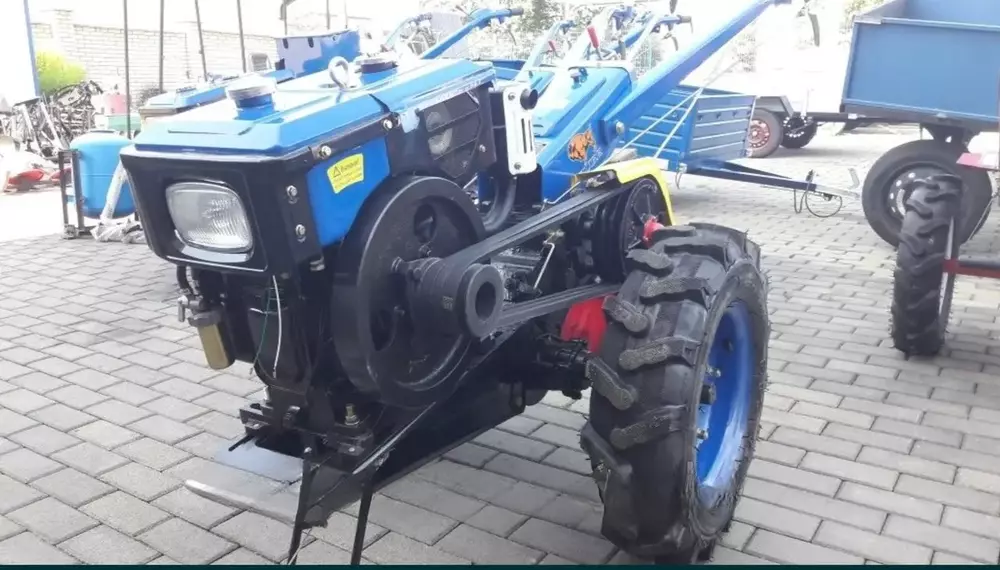 Також є задній шестерний вал відбору потужності для фрези і передній ремінний для підключення роторної сінокосарки та вібраційної картоплекопалки. За допомогою причепа можна перевозити вантажі до 500 кг.