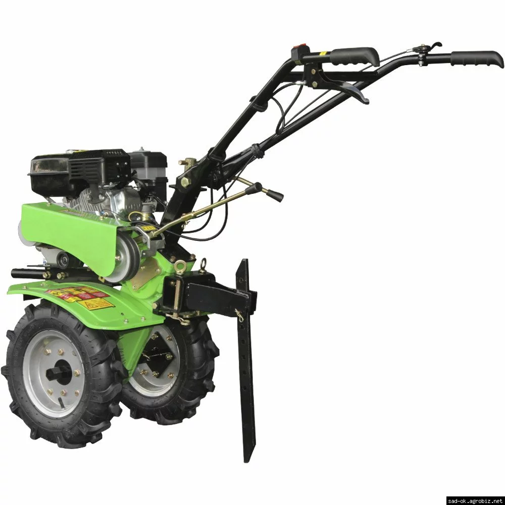 Два приводных ремня; разборной редуктор из чугуна; возможность подключения роторной косилки; воздушный фильтр масляного типа; регулировка по высоте руля с возможностью разворота на 180°; кнопка экстренной остановки двигателя на руле; металлические ручки управления