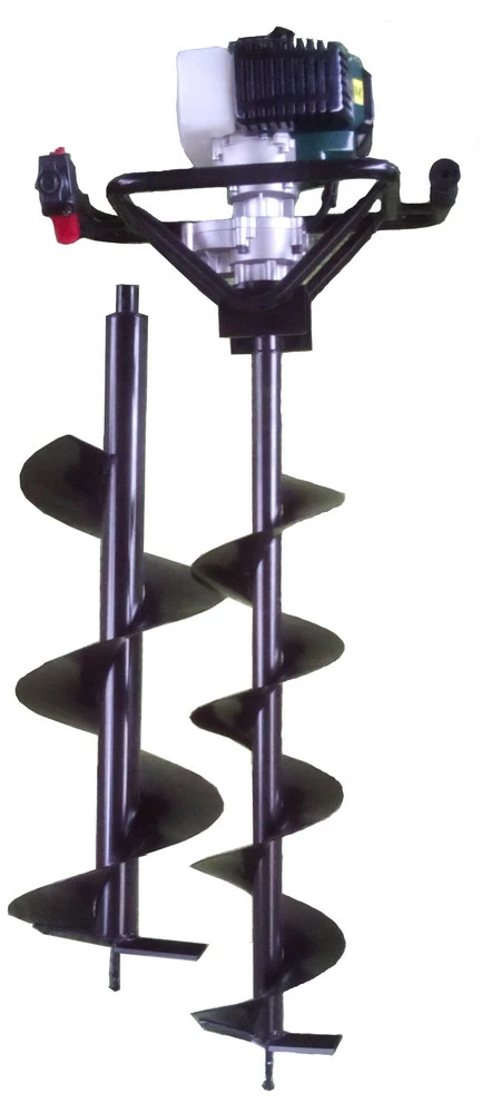 Двигатель бензиновый 2-х тактный Тип охлаждения-воздушное Мощность: 3,5 л.с. Объем: 52 см.куб. Обороты двиг.без нагрузки 3000 об/мин Передаточное число редуктора 1:40 Объем топливного бака 1,2л Рекомендуемое топливо А-95 Топливная смесь 1:50 (1л А-95+20мл масло 2Т) Комплектуется двумя бурами 20см х 100см и 30смх100см Может работать с бурами: 10-15-20-25-30 см Вес нетто: 20 кг Мотобур это специальное приспособление для бурения отверстий и ям во время садового хозяйства и строительных работ. Такие инструменты активно используются в абсолютно разнообразных сферах. Поэтому достаточно сложно отнести их к какой-то определенной отрасли. Мотобур очень облегчает выполнение работ при посадке огромного числа деревьев или при подготовке большого количества ям для строительства, последующего за этим. В целом, мотобуры конструктивно комплектуются мощным двухтактным или четырехтактным бензиновым двигателем, который выгодно отличается традиционной легкостью в обслуживании, и не доставляет никаких хлопот и проблем при правильной эксплуатации. На практике работать с мотобуром могут как один, так и два оператора. Зависит это от поставленной задачи и непосредственно самого оборудования. При работе двумя операторами работы ведутся гораздо увереннее и быстрее, особенно в таких случаях, когда нужно производить бурение отверстий большего диаметра. Во время работы с мотобуром каждому необходимо четко понимать и соблюдать правила техники безопасности, потому что этот инструмент характеризуется крутящим моментом и повышенной мощностью. Какой лучше купить мото бур посоветовать сложно, этот выбор зависит и от бюджета, и от поставленных задач перед спецтехникой. В ценовом отношении использование мотобура удовольствие достаточно недешевое, и предварительно необходимо взвесить все положительные и отрицательные стороны, чтобы не выяснилось, что задачи на практике оказались намного сложнее и серьезнее, чем общие параметры агрегата, которые учитывались при покупке, а также чтобы агрегат не простаивал впустую. Мотобур может быть профессиональным и бытовым. Бытовые модели это легкое и удобное оборудование, с которым справится без проблем один оператор. Профессиональные усиленные модели оснащаются шнеками большего диаметра и мощным двигателем. Такой агрегат представляет собой прочную и жесткую конструкцию, и для контакта с ним потребуется работа двух операторов. Различаются также мотобуры для работ на грунте, земляные, ледовые, и которые используются для сверления лунок. Мотобур это универсальный инструмент, который предназначен для самых разных работ. Производители неустанно заботятся о безопасности операторов, которые работают с мотобурами, поэтому снабжают все модели особой системой аварийной остановки двигателя, которая автоматически срабатывает при застревании бура или потере управления. А специальными рычагами техника блокируется от случайного включения, что очень удобно. Буровая головка является режущим или ударным инструментом, крепящимся на конце нижней штанги к буровой колонке. Вращательный или режущий бур врезается в породу в результате вращения, опускаясь при этом вглубь, а порода в процессе заполняет полости между режущими плоскостями бура. После работы буровая колонка с буром извлекается и очищается от породы. Когда буровая головка имеет ма