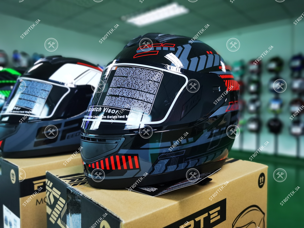 Мотошлем 902 Forte черно-красный, L Мотошлем 902 Forte - удобная и яркая модель выполненная в черно-красном цвете. Шлем выполнен из качественного ABS-пластика. Важным плюсом модели является сьемный подголовник.