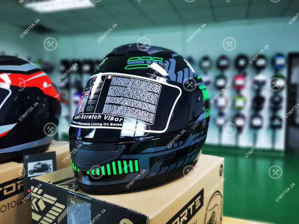 Мотошлем 902 Forte черно-зеленый, L Мотошлем 902 Forte - удобная и яркая модель выполненная в черно-зеленом цвете. Шлем выполнен из качественного ABS-пластика. Важным плюсом модели является сьемный подголовник.