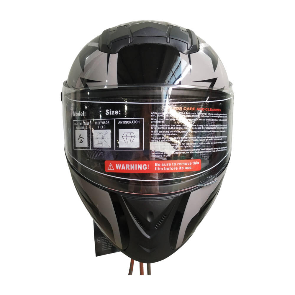 Опис мотошолома чорно-сірого кольору FORTE M61D Мотошолом чорно-сірого кольору FORTE M61D — засіб пасивного захисту голови водія при їзді на мотоциклі чи моторолері. Крім захисту голови у разі аварії, шолом оберігає від зустрічного вітру, води, каміння, комах та пилу.