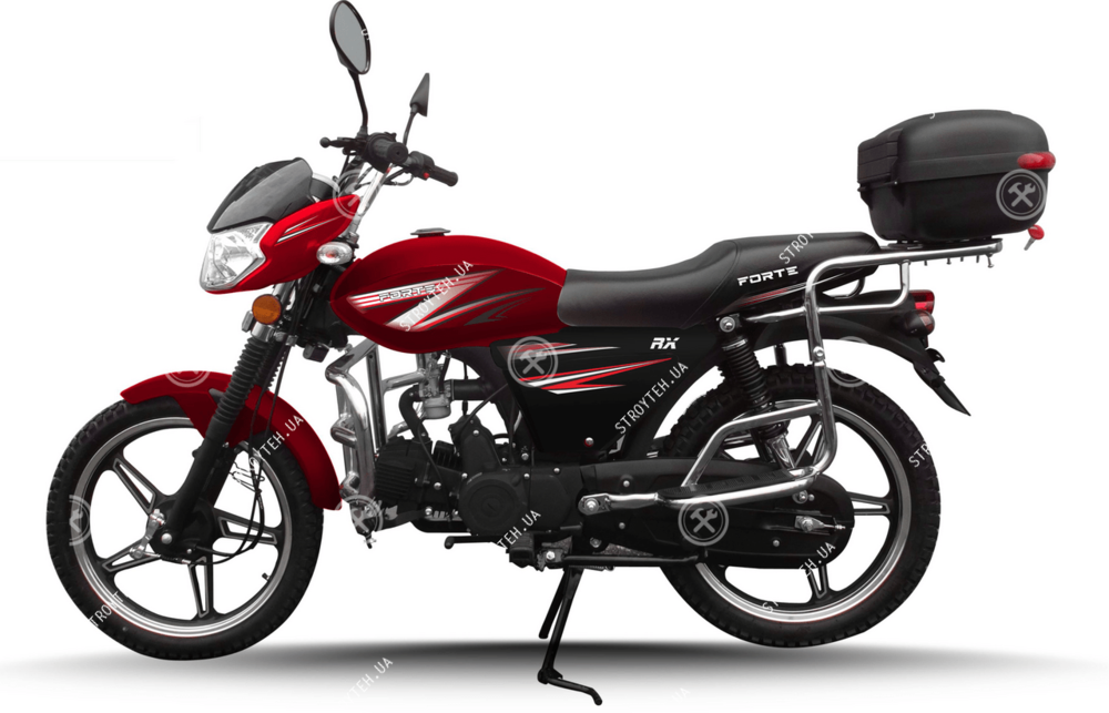 Мотоцикл NEW FT125-RX красный Forte Дорожный мотоцикл Forte NEW FT125-RX - стильная новая модель с усовершенственым дизайном спидометра и тахометра. Максимальная скорость 90 км/час. Оборудован бензиновым карбюраторным двигателем 125 см3 мощностью 8 л.с. В модели установлено воздушное охлаждение. Средний расход топлива - 2,3 л/100 км. Мотоцикл оснащен гидравлическими дисковыми тормозами с вентиляцией, легкосплавными дисками, защитой для ног водителя, а также USB-разьемом. Для удобства пользователя предусмотрено широкую заднюю подножку для пассажира и задний багажник с пластиковым боксом.