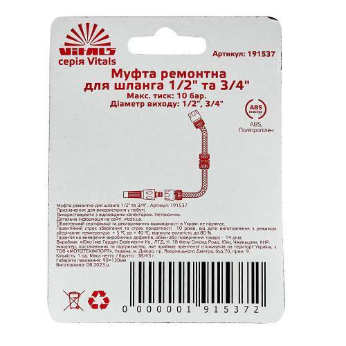 Муфта ремонтна для шланга ½" та ¾" Vitals є універсальним інструментом, призначеним для швидкого та надійного з'єднання, подовження або ремонту двох відрізків шланга з діаметром 1/2" та 3/4".