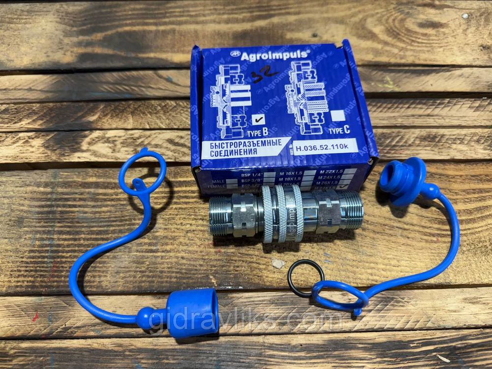 Муфта розривна євро клапан Н.036.52.110К S32 (М27×1,5) призначена для використання в гідравлічних системах тракторів, комбайнів, сільськогосподарської та спеціальної техніки. Вона забезпечує швидке та надійне роз’єднання/з’єднання рукавів високого тиску, запобігаючи витоку масла завдяки вбудованому євро клапану.